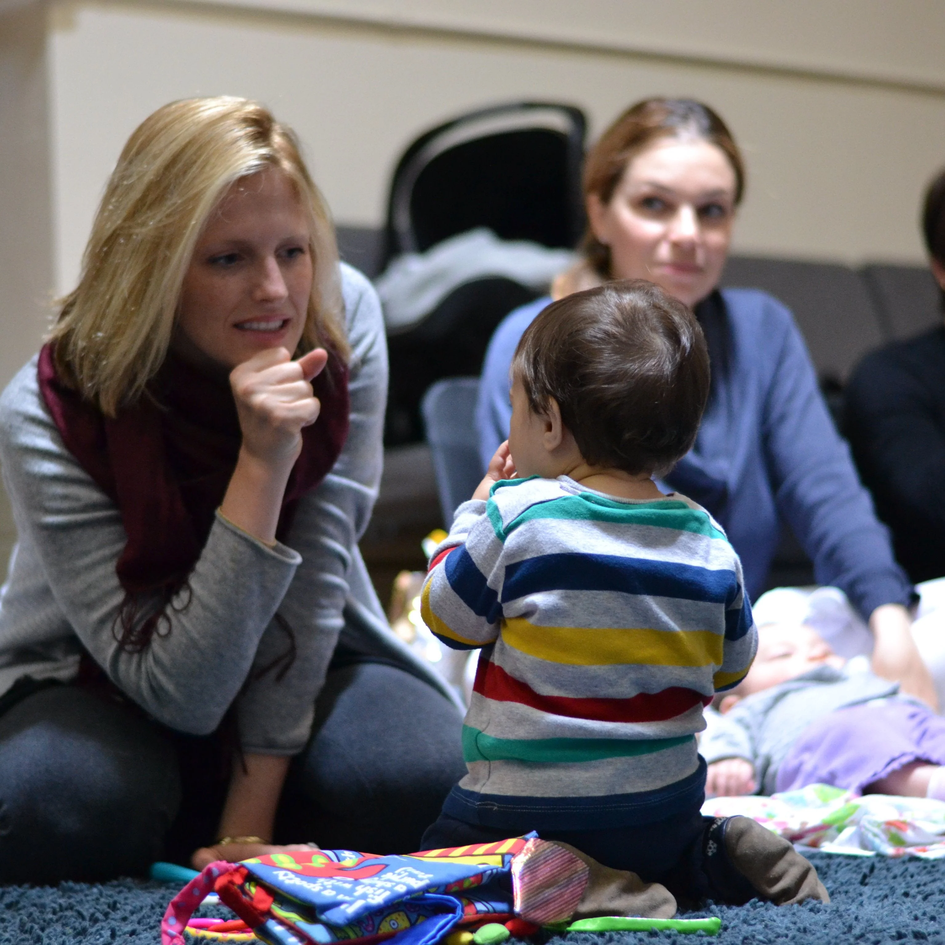 Babies are welcome. However, babies are not required to to attend class. If your baby is napping or cranky, it is perfectly fine to come without your baby because we are teaching you, the parents, American sign language. At this stage of the game, the babies are just along for the ride. We call these classes "playgroups" not because the babies are playing; It's you, the grown-ups that are playing, having fun growing your vocabulary and sign language skills, using the signs with interactive games and songs. If anyone has a really active toddler on the move it is fine to attend sans child so that you can focus on the ASL lesson plans. That being said, we can handle active toddlers.